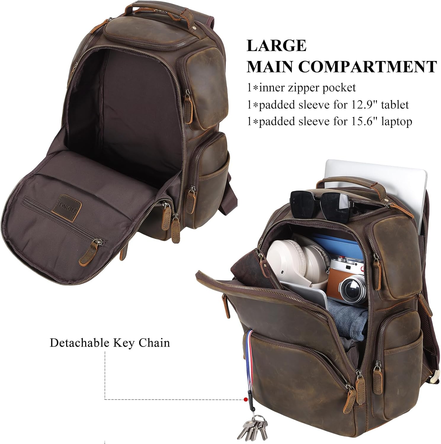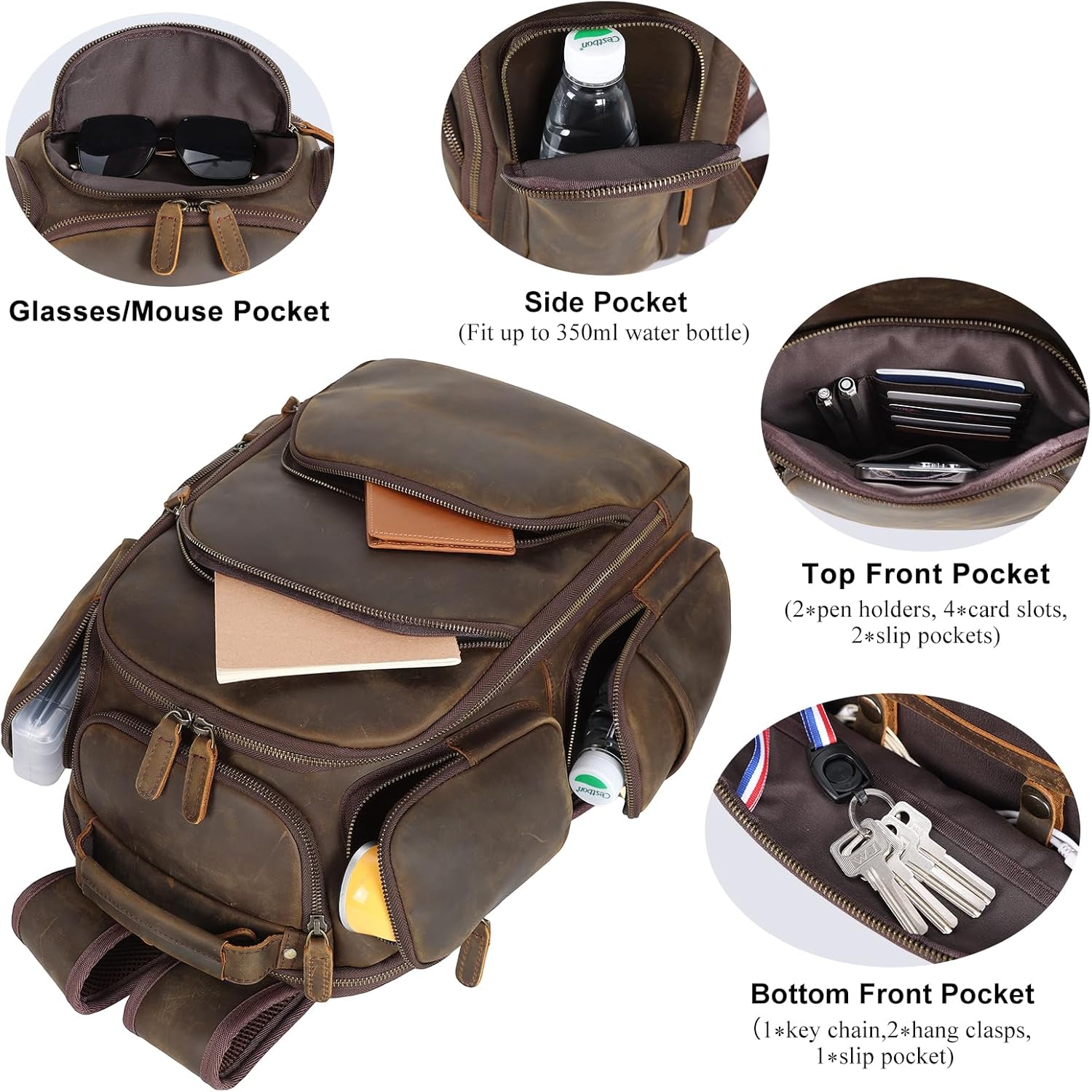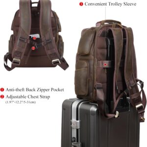 TIDING Vintage Full Grain Leather 16 Inch Laptop Backpack for Men Multi Pockets Travel Rucksack Weekend Business Daypack_Large